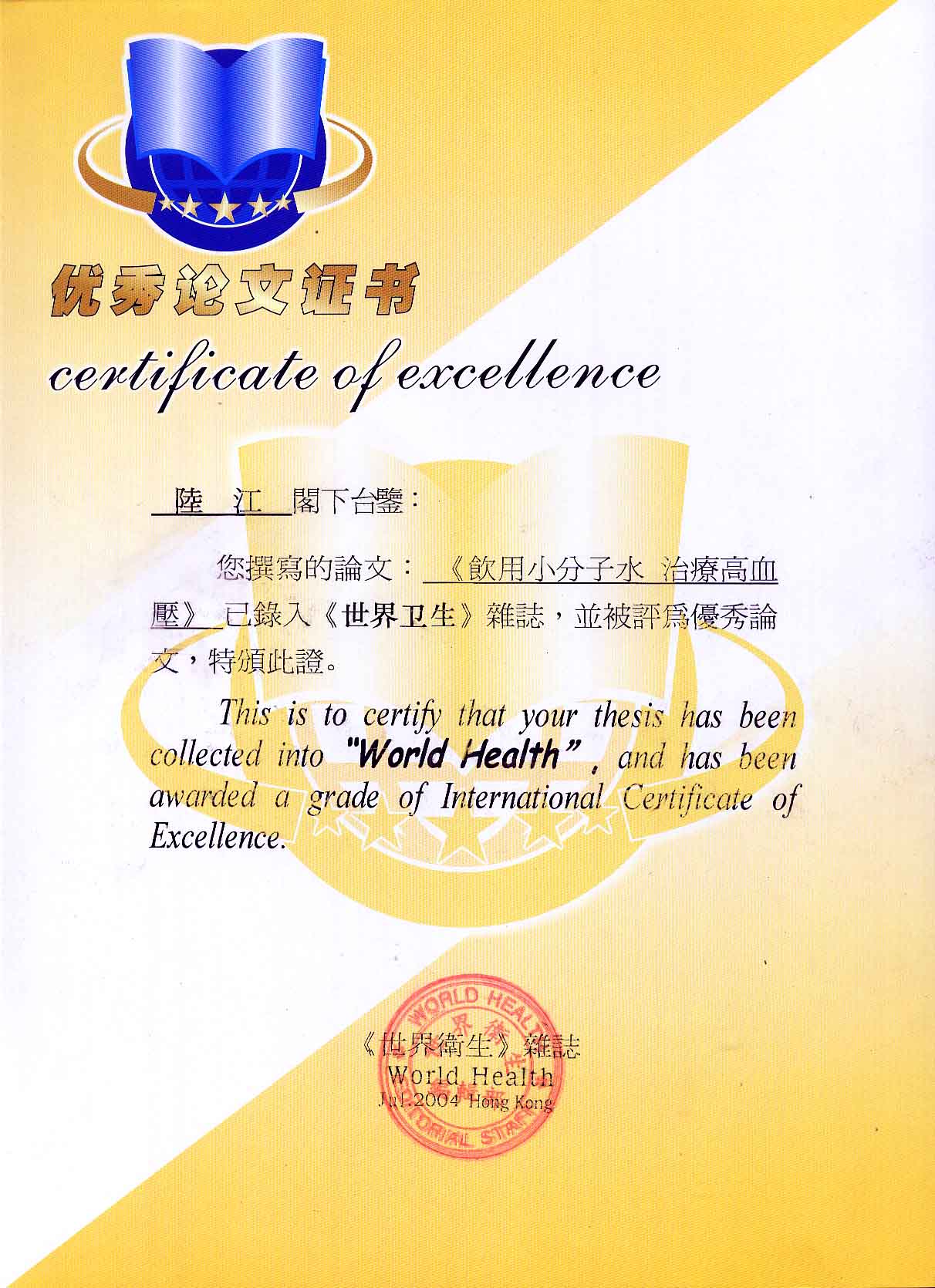 一、創(chuàng)造了在家在職場使用方便的微小分子團水器具。在世界上首先用此理療方法,大規(guī)模地成功地逆轉和消除動脈粥樣硬化,確實祛俆高血壓和冠心病與糖尿病,使患者恢復動脈和心臟及胰島的健康,可消除因細胞缺水使器官衰弱而形成多種器官的缺水性病癥,并使健康人可預防和減緩動脈粥樣硬化,減少心腦血管病,具有重大的社會經(jīng)濟和戰(zhàn)略意義。