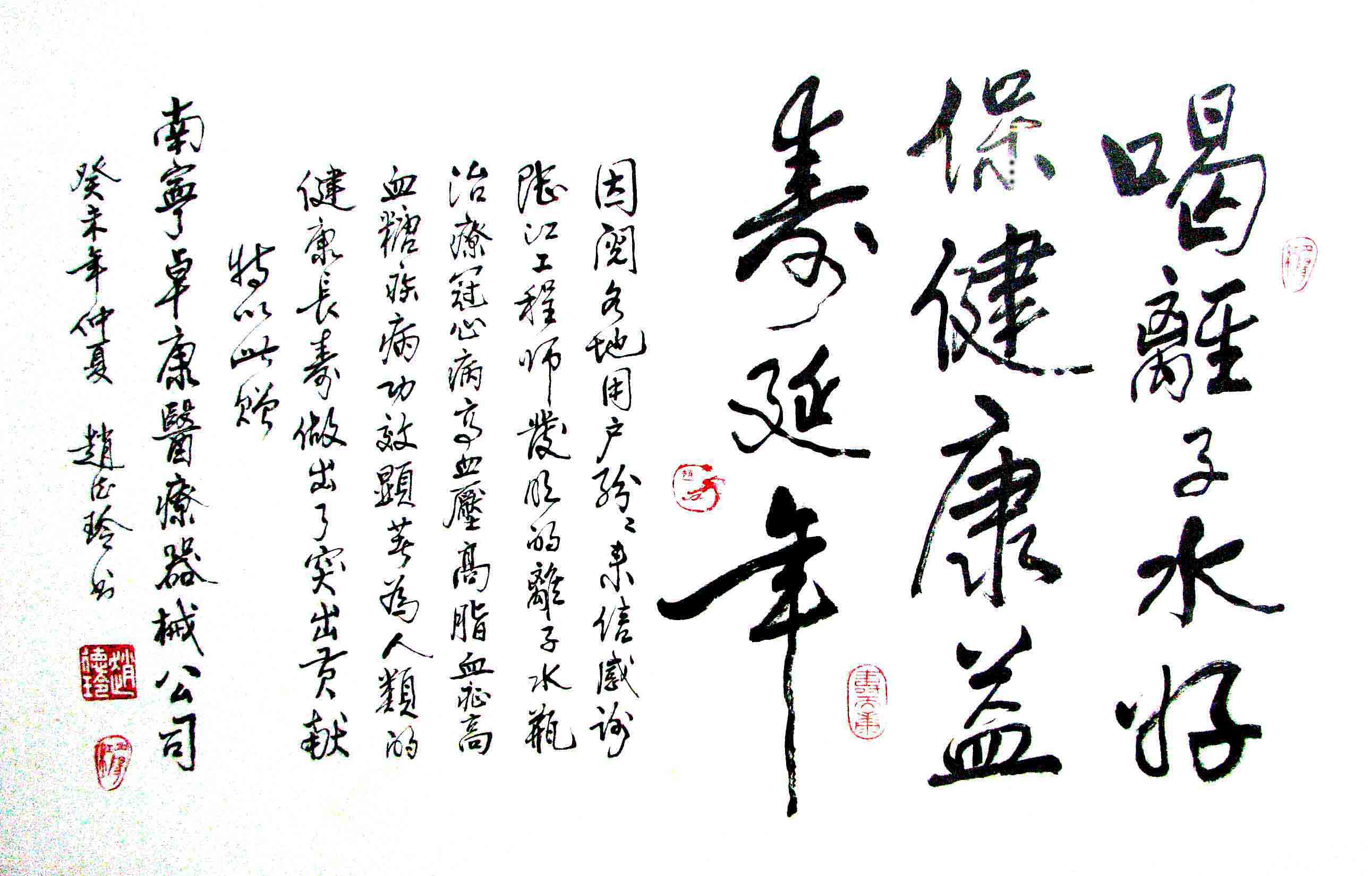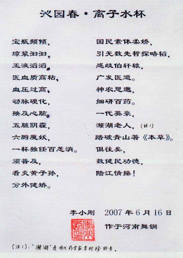 -----我是從事建筑的高工,本來沒有資格去攻克醫(yī)學難題,卻為了自身健康才扣響醫(yī)學的大門。由于我1990年患高血壓,因怕中風才研究發(fā)明了離子水瓶,我把水處理成微小分子團水,飲用后治愈了高血壓。便于1993年底送到三家省級醫(yī)院做臨床試用4個月。經(jīng)北京和廣西醫(yī)學專家鑒定:"降脂降壓效果好"," 能擴大心腦動脈流量,改善心腦電圖以及微循環(huán)","對治療心腦動脈粥樣硬化、高血壓、高血脂有良好的醫(yī)療保健作用。""產(chǎn)品的技術性能和療效達到了同類產(chǎn)品的國內(nèi)領先水平,經(jīng)廣西醫(yī)學科學情報研究所檢索,未見國外有類似報道。"中國醫(yī)學科學院張正國教授從美國國立醫(yī)學圖書館數(shù)據(jù)庫存Medline檢索英俄文資料,均未見類似報告。2000年上市后,我為了對消費者負責而繼續(xù)觀察研究,一直通過《信譽卡》和《質(zhì)量跟蹤調(diào)查書》向患者承諾療效,請用戶使用6個月后反饋效果。和脂壓患者飲用2至5個月內(nèi),消除癥狀,停服藥物,血壓正常;冠心病患者飲用3~5個月逐漸減輕至消除心絞痛、房顫等癥狀,不再服藥,飲用1年左右心電圖正常,經(jīng)冠脈造影掃描無明顯狹窄,表明冠心病痊愈。大量患者還反映許多衰弱器官被修復,讓前列腺增生、慢性咽喉炎、慢性氣管炎、支氣管炎、慢性胃炎、腸炎和膽囊炎等不藥而愈;2型糖尿病患者是因為胰島衰弱致病,飲用該水半年至一年,逐漸減藥至停藥,血糖尿糖正常,真正治愈2型糖尿病。中風后遺癥患者飲用六七個月,可逐漸減輕至消除肢體和語言障礙,表明飲用該水能讓壽命很長的神經(jīng)元細胞逐漸修復,奇跡般地恢復肢體和語言功能。飲用后還使胸腺和脾臟兩個重要的免疫器官被修復和增強,產(chǎn)生免疫細胞多,提高了免疫力,使人不生病或少生病。自此, 飲用微小分子團水創(chuàng)造了攻克冠心病、高(低)血壓和糖尿病三大醫(yī)學難題的奇跡。人們對此感到不可思議,但實踐是檢驗真理的唯一標準。